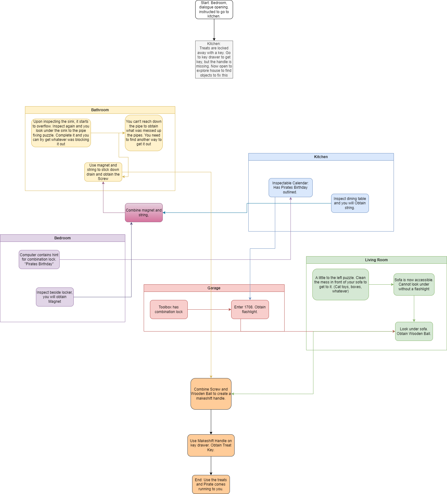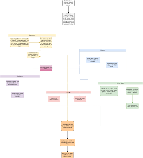 I finalised the puzzles that are going to be in the game! To be able to communicate how the game flow works and how the puzzles and rooms interconnect in the game I made a flowchart for my teammates. Designed with Draw.io.